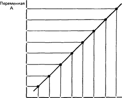 Корреляционный анализ При изучении корреляций стараются установить, существует ли какая-то связь между двумя показателями в одной выборке (например, между ростом и весом детей или между уровнем IQ и школьной успеваемостью) либо между двумя различными выборками (например, при сравнении пар близнецов), и если эта связь существует, то сопровождается ли увеличение одного показателя возрастанием (положительная корреляция) или уменьшением (отрицательная корреляция) другого. Иными словами, корреляционный анализ помогает установить, можно ли предсказывать возможные значения одного показателя, зная величину другого. До сих пор при анализе результатов нашего опыта по изучению действия марихуаны мы сознательно игнорировали такой показатель, как время реакции. Между тем было бы интересно проверить, существует ли" связь между эффективностью реакций и их быстротой. Это позволило бы, например, утверждать, что чем человек медлительнее, тем точнее и эффективнее будут его действия и наоборот. С этой целью можно использовать два разных способа: параметрический метод расчета коэффициента Браве - Пирсона (г) и вычисление коэффициента корреляции рангов Спирмена (г,), который применяется к порядковым данным, т. е. является непараметрическим. Однако разберемся сначала в том, что такое коэффициент корреляции. Коэффициент корреляции - это величина, которая может варьировать в пределах от +1 до — 1. В случае полной положительной корреляции этот коэффициент равен плюс 1, а при полной отрицательной - минус 1. На графике этому соответствует прямая линия, проходящая через точки пересечения значений каждой пары данных: . Переменная 8