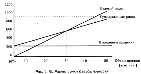 Далее к данной группе следует отнести расчет цены на основе определения «точки безубыточности», т.е. положения нулевой прибыли или нулевых убытков на графике безубыточности, иллюстрирующем изменение валового дохода, прибыли и суммарных издержек в зависимости от объема продаж (рис. 1.10).