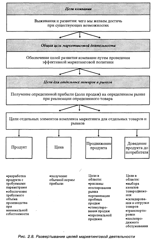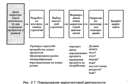 В основу разработки стратегического плана ложится анализ перспектив развития организации при определенных предположениях об изменении внешней среды, в которой она функционирует. Важнейшим элементом этого анализа является определение позиций организации в конкурентной борьбе за рынки сбыта своей продукции. На основе такого анализа формируются цели развития организации, формируются СХЕ и выбираются стратегии их достижения. Если долгосрочный и годовой планы организации имеют дело с планированием выбранных направлений развития организации, то в рамках стратегического планирования решаются вопросы о том, какие новые направления следует развивать, а какие из существующих — ликвидировать. Стратегическое планирование направлено на адаптацию деятельности организации к постоянно меняющимся условиям внешней среды и на извлечение выгод из новых возможностей. Процесс планирования в компании начинается с определения исходных целей ее развития и деятельности, в основу разработки которых многие компании кладут цели-миссии (рис. 2.5). По сути дела цели-миссии, или главные стратегические цели, — это видение того, что из себя должна представлять компания или за что она должна бороться. В них должны быть отражены интересы всех групп влияния (акционеры, менеджеры, сотрудники и рабочие, поставщики, банки, правительственные учреждения, местные органы управления, общественные организации и др.). Цели-миссии должны подчеркивать социальную значимость компании и служить средством консолидации и мотивации персонала компании. Интересы заинтересованных лиц и организаций (групп влияния) учитываются также при выработке исходных целей компании. Исходные цели пропускают через тройной фильтр: доступные ресурсы в стране и за границей, окружающая среда, а также внутренние возможности и результаты деятельности компании. Последние два фильтра по существу представляют собой ситуационный анализ. Результаты ситуационного анализа часто суммируются в разделе плана маркетинга под названием «SWOT (СВОТ)-анализ» (первые буквы английских слов: strengths — сильные стороны, weaknesses — слабые стороны, opportunities— возможности и threats — опасности — см. ниже). В результаты ситуационного анализа также включаются предположения о будущих условиях деятельности организации, а кроме того, прогнозные оценки ожидаемого спроса на потенциальных рынках на период действия плана маркетинга. На основе этих предположений и оценок в последующих разделах плана маркетинга устанавливаются цели маркетинговой деятельности, выбираются стратегии и разрабатываются программы маркетинга. Разработка стратегического плана в штаб-квартире организации заканчивается формированием хозяйственного портфеля (см. ниже), на основе которого в подразделениях организации осуществляется разработка функциональных стратегий. Функциональные стратегии разрабатываются в рамках функциональных подразделений отдельных СХЕ организации. Каждое функциональное подразделение (маркетинга, финансов, производства, снабжения и др.) исходя из стратегического плана организации разрабатывает стратегические планы своей деятельности (рис. 2.6). Рассмотрим разработку плана маркетинга (рис. 2.7). Исходя из целей и стратегий развития компании осуществляется анализ маркетинговой деятельности за предшествующий 