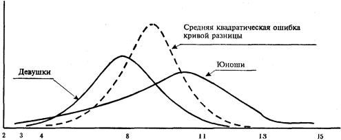 Числитель данной формулы характеризует разницу средних. Кроме того, необходимо учесть различие формы двух кривых распределения. Это осуществляется в знаменателе формулы. Выборочное распределение теперь рассматривается как выборочное распределение разницы между средними (процентными мерами). Если нулевая гипотеза справедлива, то распределение разницы является нормальной кривой со средней, равной нулю, и средней квадратической ошибкой, равной 1. Видно, что величина 6,43 существенно превышает значение ±1,96 (95%-ный уровень доверительности) и ±2,58 (99%-ный уровень доверительности). Это означает, что нулевая гипотеза не является истинной. На рис. 4.6 приводятся кривые распределения для этих двух сравниваемых выборок и средняя квадратическая ошибка кривой разницы. Средняя квадратическая ошибка средней кривой разницы равна 0. Вследствие большого значения среднеквадратических ошибок вероятность справедливости нулевой гипотезы об отсутствии разницы между двумя средними меньше 0,001.
