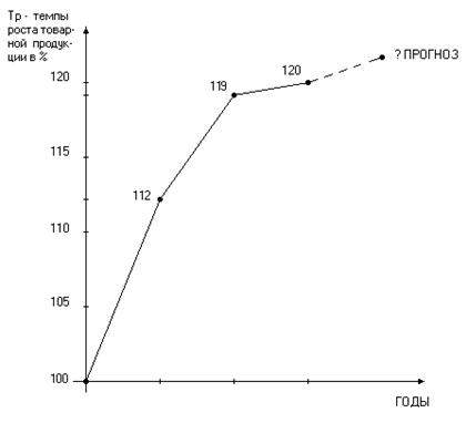Ломаная показывает ежегодные темпы роста, а, следовательно, и прироста объема товарной продукции. Кроме того, ее наличие позволяет сделать прогноз на ближайший год. Для этого используют специальный математический аппарат – корреляционно-регрессионный анализ, который позволяет установить вид связи между временем и темпами роста и по найденной зависимости определить величину темпа роста в следующем периоде. Для лучшей сопоставимости данных в условиях значительной инфляции (сейчас в России приблизительно 15 - 17% в год, в Японии приблизительно 1 – 2%) такие динамики строят в сопоставимых ценах (это цены 1991 года).