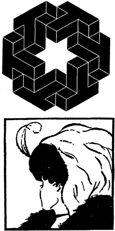 На рис. 5 изображен ставший классическим рисунок американского психолога Э. Боринга «Жена или теща». Возможно, что на популярность этого рисунка среди специалистов психологов повлияла и тематика рисунка, однако нужно сказать, что за традиционно веселым, несерьезным названием скрывается важная проблема. В повседневной жизни мы привыкли к тому, что узнавание происходит легко и быстро, возможно, по этой причине часто кажется, что процесс узнавания прост и ясен. Однако это не так. В предыдущих разделах мы рассмотрели некоторые примеры, дающие возможность более подробно проанализировать характерные черты процесса узнавания, обратить внимание на обычно скрытые стороны этого акта. Эти примеры сразу же показали, что, как правило, человек в ходе своей жизнедеятельности использует свое зрение в качестве безукоризненно работающего прибора. В кибернетике существует понятие «черного ящика» (пожалуйста, не путайте с «черным ящиком», служащим для целей объективной регистрации событий). Под «черным ящиком» подразумевают любой сложный блок живой или неживой системы, о работе которого известно только то, какой вид имеют входные и выходные сигналы. Что происходит в самом «ящике», неизвестно. Сведения о работе блока исследователи иногда получают, подавая различные типы входных сигналов, и снимая, регистрируя соответствующие выходные реакции. Для человека, выступающего в роли пользователя (используем этот распространенный среди людей, связанных с компьютерной техникой, термин), зрение является именно «черным ящиком». Мы пользуемся результатами его деятельности и совершенно не знаем при этом, как он устроен. Заметьте, что то же самое имеет место при использовании нами большинства приборов, начиная от телевизора и кончая компьютером. Однако, если мы хотим проникнуть внутрь структуры «черного ящика» (а именно этим мы и занимаемся в данной книге), то мы должны обращать пристальное внимание на соотношение входных и выходных сигналов. Именно такое внимание дало исследователям интереснейшую информацию при изучении восприятия прозревших людей. В этой главе мы рассмотрим другой вид необычных входных сигналов с тем, чтобы на основании странных, нетипичных ответов на эти сигналы получить сведения о структуре и работе того «черного ящика», который мы называем человеческим зрением и функциями которого являются восприятие и узнавание. Вернемся к двуединому портрету тещи и жены. Необычность этой картинки заключается в том, что в отличие от большинства встречающихся нам в жизни картин она допускает двойственный ответ. Давайте проанализируем, за счет чего создается такой эффект. Никто не знает, что он увидит, взглянув впервые на эту неоднозначную картину. Допустим, Вы увидели лицо молодой девушки в профиль. Но при всех условиях после недолгого, в несколько секунд, рассматривания это лицо как-то незаметно превратится в лицо старой женщины. Происходит какая-то не уловимая сознанием подмена одного изображения другим. Проведем пофрагментный анализ хода процесса восприятия в обоих случаях, другими словами, будем записывать наши интерпретации одних и тех же фрагментов в случае восприятия «тещи» и в случае узнавания «девушки».