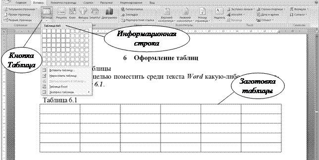 Обрамление таблицы Изменения в форме таблицы Создание таблицы Оформление таблиц Зададимся целью поместить среди текста Word какую-либо таблицу, например таблицу 7.1. Начинается создание таблицы с задания числа её ячеек. В нашей таблице ячейки разделены на 6 столбцов и 5 строк. Первым делом надо установить курсор в окне Word в то место, где будет находиться левый верхний угол таблицы. Далее воспользуемся кнопкой Таблица на вкладке Вставка (рисунок 7.1). Появится макет, в котором заказывается число столбцов и строк будущей таблицы (рисунок 7.1). Укажем на нём 6 столбцов и 5 строк. Ячейки макета помечаются протягиванием мыши, при этом на месте курсора прорисовывается границы будущей таблицы. Размер выбранной вами таблицы виден в информационной строке макета. Достигнув нужной клетки в макете, надо нажать левую кнопку мыши. В окне Word на месте курсора останутся линии. Это заготовка для будущей таблицы (рисунок 7.1).