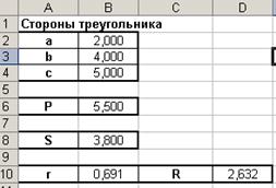 В ячейку В8 введите формулу: =КОРЕНЬ(р*(р-а)*(р-b)*(р-с_)). В ячейку В10 введите формулу: = S/p. А в ячейку D10 формулу: =(a*b*c)/(4*S). Отформатируйте ячейки со значениями с точностью до трех знаков (меню Формат/ Ячейки – вкладка Число). В итоге должен получиться результат, представленный на рисунке слева.