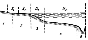 Рис. 39. Зоны отложения морских осадков и их соотношение с областями рельефа дна Мирового океана. Неритовые осадки: I1 – литоральной зоны, I2 – мелководно зоны; пелагические осадки: II1 – батиальной зоны, II2 – абиссальной зоны. 1 – суша; 2 – шельф; 3 – склон; 4 – океаническое ложе; 5 глубоководные впадины
