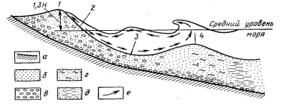 Рис. 40. Основные элементы пляжа и мелководной зоны. а – коренные отложения берега; б – пески; в – галька; г – алевриты; д – глины; е – направление циркуляции воды. 1 – береговой вал; 2 – фронтальная зона пляжа; 3 – вдольбереговая ложбина; 4 – подводный вал; Н – высота волны