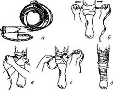 Мал. 66. Стандартний гумовий джгут: а - схема накладання; б - підготовка до накладання, в - початок накладання; г — фіксація першого оберту; д — кінцевий вигляд після накладання.
