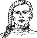 При кровотечі із судинного пучка на шиї для притиснення сонної артерії джгут накладають за допомогою шини (фанерної або Крамера) способом Микуліча (мал. 69). Шину накладають зі здорового боку, впираючись до голови і плеча. Вона є каркасом, на якому джгут натягається навколо шиї, здавлюючи при цьому судинний пучок тільки з одного боку. При відсутності шини можна використати руку потерпілого (мал. 70). Для цього її кладуть на голову й фіксують Мал. 68. Накладання джгута-закрутки, бинтом, використовуючи використовуючи пасок або косинку. замість шини плече. Під