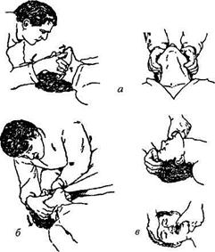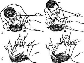 Мол. 73. Схема проведення штучного дихання: а — методом «рот в рот»; б - «рот в ніс». - під лопатки підкладається згорнутий одяг, для закидання голови - для підвищення ефективності масажу серця потрібно трохи підняти ноги потерпілого (на 0,5 м), щоб забезпечити кращий приплив крові у серце з вен нижньої частини; - розстібають одяг, що стискає грудну клітку; - перевіряють чи вільні дихальні шляхи (їх може закривати язик, Після цих підготовчих дій можна приступити до штучної вентиляції легень і масажу серця. Штучна вентиляція легенів «рот у рот» Найефективнішою вважається штучна вентиляція легенів за методом «рот у рот» або «рот у ніс». При цьому в легені хворого (потерпілого) вдувають до 1,5 л повітря, що за об'ємом дорівнює одному глибокому вдиху здорової людини. Легені розширюються, рефлекторно