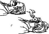 Мал. 74. Потрійний прийом, який використовується при реанімації: а - максимальне розгинання голови назад; б — висунення нижньої щелепи вперед; в - відкривання рота; г — схематичне зображення здобутого результату. подразнюючи дихальний центр головного мозку. Це, у свою чергу, сприяє відновленню самостійних дихальних рухів та створює в організмі умови для газообміну (мал. 73а). Техніка проведення. Людина, яка надає допомогу, стає з лівої сторони біля голови потерпілого на коліна чи стоїть (якщо хворий лежить на ліжку зі щитом, столі, тапчані), ліву руку підсовує під шию, праву кладе на чоло й максимально закидає голову назад, першим і другим пальцями закриває крила носа (ніздрі), робить глибокий вдих. Щільно, герметично охоплює відкритим ротом губи потерпілого, які попередньо за можливістю накривають куском бинта, марлі, але не хустинкою). Роблять різкий сильний вдих; середня тривалість видиху - 1 секунда. Частота вдувань повітря - 14-16 за хвилину. При кожному вдихуванні необхідно стежити за дихальними рухами передньої стінки грудної клітки. Після вдування повітря негайно звільнити рот хворого. Контролювати пасивний видих за спаданням передньої грудної клітки і звуком повітря, яке виходить. Періодично натискати на надчеревну ділянку для видалення повітря зі шлунка. Відсутність дихальних рухів передньої грудної стінки, роздування надчеревної ділянки свідчить про попадання повітря в шлунок унаслідок недостатнього закидання голови. Штучна вентиляція легенів «рот у ніс» Цей метод використовується при травматичному ушкодженні нижньої щелепи або у тому випадку, коли щелепи сильно стиснуті й неможливо їх розтулити (мал. 736). Техніка проведення. Зафіксувати правою рукою голову в закинутому положенні. Пальцями лівої руки затиснути рот. Зробити глибокий вдих. Щільно, герметично охопити відкритим ротом ніс потерпілого (хворого). Зробити досить різкий, сильний видих. Негайно звільнити ніс і рот хворого. Пильно слідкувати за рухом передньої грудної стінки.