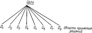 Рис. 28. Организационная схема управления маркетингом Предположим, что директору по вопросам маркетинга (см. рис. 28) необходимо разработать стратегию маркетинга: какая коммуникационная сеть должна быть принята? «Каждый с каждым» была бы наиболее приемлемой, поскольку участники обсуждали бы свои идеи всей группой, когда в этом возникает необходимость. Это обеспечивало бы всестороннюю проверку идей и устранение конфликтов. Напротив, если директор по вопросам маркетинга принимает решения только о сроках проведения ежегодных совещаний по сбыту, «колесо» будет более подходящей сетью, поскольку для такого решения директор просто запрашивает соответствующую информацию у подчиненных. Сеть можно проверять так же, как проверяется информация, получаемая менеджером. 1. Сеть может быть неадекватной. Кто-нибудь может оказаться не включенным в сеть. Например, коммивояжеров могут не информировать о целях рекламной кампании, хотя такая информация необходима им для планирования своей работы. 2. Сами каналы могут быть перегружены. Как и в случае с телефонной службой, может стать необходимым: а) увеличение числа каналов; б) установление очередности. Это положение Роу поясняет следующим образом: «Поток информации может вносить запаздывания в систему из-за наличия очереди. В этом смысле информацию, проходящую через ряд руководителей, можно сравнить с потоком работ на предприятии либо с потоком автомобилей на шоссе. Например, если принимающий решение рассматривается как обрабатывающий центр, объем поступающих данных и время, необходимое для принятия решения, будут определять средний размер задержки. Если присвоить принимаемым решениям соответствующие приоритеты, это позволит как повысить эффективность сети, так и уменьшить время задержки. Другой способ уменьшения задержек - использование запасных каналов. Фильтрация или отбор решений - еще один способ сокращения времени прохождения через систему»; в) допущение более высокой степени ошибок: избыточность информации как средство устранения ошибок не всегда возможна. Исключение составляют сообщения, которые необходимо передать точно и в первую очередь. 3. Сеть может быть проверена на экономичность. а) Списки адресатов информации могут быть слишком обширными. б) Возможно, источник информации и место назначения могут быть сближены. в) Возможно, выбран не самый эффективный канал. 4. Передача сообщений по сети может быть слишком медленной. Время передачи можно исчислить для каждого канала, а суммарное время сопоставить с желаемым и использовать это отношение как базу при рассмотрении других сетей. Дж. Форрестер, профессор Массачусетского технологического института, показал, как внутренние задержки в коммуникациях могут создавать колебания выпуска продукции и запасов на складах, ошибочно приписываемые внешним воздействиям. ГРУППИРОВКА ОБЛАСТЕЙ ПРИНЯТИЯ РЕШЕНИЙ С ЦЕЛЬЮ МИНИМИЗАЦИИ ЗАГРУЖЕННОСТИ КОММУНИКАЦИИ Мы утверждали выше, что можно изображать организационную структуру в виде иерархии подсистем решений. Таким образом, для достижения целей организации необходимо точно определить основные области решений. На рис. 29 показаны восемь таких областей. Для координации необходимо взаимодействие между этими решениями. Чем теснее взаимодействие, тем сильнее взаимозависимость и больше 