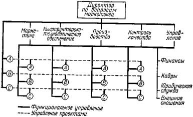 Рис. 31. Матричная организация Потребность в управлении по проектам часто выявляется с помощью анализа сетей (например, по Э. Баттерсби) и иногда приводит в первом приближении к матричному типу организации, который изображен на рис. 31. При этой форме организации специалисты, занятые в проекте, подчиняются как функциональному руководителю, так и координатору проекта. Специалисты являются одновременно и членами функциональной группы, и членами бригады проекта [Подробно об управлении по проектам см.: L. Sау1еs and М. Chandler Managing Large Systems. Harper & Row, 1971, Ch. 10 and 11.]. Матричная организация не всегда приводит к той степени контроля над проектом, которая считается необходимой, и может возникнуть конфликт между функциональным управляющим и координатором проекта. «Матричный» руководитель не может отдавать распоряжений ни одному из функциональных руководителей, а вынужден рассчитывать лишь на «консультации, кооперацию, компромисс». Кроме того, исполнители проекта имеют практически двух начальников и поэтому иногда сомневаются, есть ли он у них вообще. И наконец, если такой конфликт возник, то спор может быть разрешен только на более высоком уровне иерархии. И как следствие, фирмы склоняются к управлению по проектам, при котором специалистов прикрепляют к проекту на весь период его осуществления, а подчиняются они на этот период только координатору проекта. Цель состоит в максимальной автономизации бригады проекта. Это может привести к дублированию работ и недоиспользованию ресурсов, однако такие потери - приемлемая плата за координацию. Компании не переходят на полное управление по проекту, а сохраняют некоторое число функциональных отделов, без которых невозможно общее руководство организацией. Кроме того, дробление всех отделов на проектной основе (юридический отдел - хороший тому пример) может оказаться явно менее эффективным, чем сохранение некоторых отделов для обслуживания компании в целом. Некоторые службы, вероятно, должны обеспечивать работу всех остальных подразделений компании, например телефонное обслуживание, почта, служба безопасности, внутризаводской транспорт, отдел внешних сношений, отдел заработной платы, отдел страхования, техническая библиотека. Степень участия таких служб в работе над проектом сильно зависит от положения бригады проекта по отношению к ним. Управление по проектам эффективно в обеспечении координации работ по отдельному проекту, в создании сильных бригад, отождествляющих свои цели с целями проекта. Однако остается еще проблема сравнения этих преимуществ со следующими потерями: 1) недоиспользование ресурсов, связанное с автономией бригад; 2) невозможность получения экономии на масштабах деятельности; 3) невозможность обеспечить координацию функций в масштабах компании. Трудно установить стандарты квалификации и унифицировать методы работы специалистов, если они недостаточно долго работают под общим руководством; 4) ненадежность положения членов проектных бригад, связанная с тем, что эти бригады расформировываются по завершении проекта. Резюмируя, можно сказать, что формирование организации на широкой функциональной основе способствует получению экономии на масштабах деятельности и координации функций в рамках компании, но проблема координации внутри отделов и (или) между отделами при эт