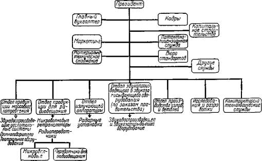 Рис. 39. Новая структура фирмы В частности, степень децентрализации и делегирования полномочий будет зависеть от соотношения затрат и прибыли, а решения о делегировании полномочий (или лишении их) будут учитывать: а) необходимость поддержания рациональных масштабов деятельности; б) необходимость единого руководства выполнением общих для всей компании функций и необходимость в координации деятельности подразделений; в) степень загруженности управляющих; г) характер деятельности; возможную противоречивость целей; является ли деятельность основной или координирующей (см. рис. 40). Организацию отделений можно рассматривать не только как путь улучшения координации для каждой группы продукции, но и как метод, облегчающий оценку выполнения работы и распределение ответственности. В условиях функциональных отделений ответственность распылена; никто не отвечает персонально за выполнение работы по конкретной группе продукции. Никто также не отвечает и за составление общих планов по видам производства. Поэтому общая система приоритетов отсутствует, общая цель недостаточно ясна. Если бы глава каждого отделения отвечал за отдельный вид производства, ответственность распылялась бы меньше, специализация была бы более эффективной и ориентированное на цель планирование было бы легче осуществлять, а линейные и функциональные связи стали бы более четкими. В отделении излучающей аппаратуры и отделении аппаратуры связи и радиоаппаратуры - особые проблемы координации: 1) координация сбыта и конструкторско-технологической подготовки для обеспечения соответствия продукции спецификациям; 2) общая координация по каждой партии для обеспечения выполнения сроков поставки. Классическим решением первой проблемы будет создание комитета, состоящего из представителей разных отделов, или установление процедуры, в соответствии с которой лицо, ответственное за сбыт, имело бы свободный доступ к соответствующему работнику конструкторско-технологического отдела. Общая координация партии изделий будет обеспечиваться группой планирования производства и контроля, координирующей выпуск каждой партии. В отделении звуковой аппаратуры основная проблема Координации состоит в увязке сбыта и производства для обеспечения соответствия производственных спецификаций требованиям правительства. Здесь снова могут быть использованы специальные комитеты, а также агенты по сбыту в качестве связных. Наконец, в отделении продукции массового потребления, где основная задача - поддержание низкой себестоимости, технологические процессы должны быть спроектированы так, чтобы обеспечивалось снижение издержек. Главное внимание должно уделяться управлению запасами. Однако эти задачи вряд ли составляют большую проблему с точки зрения координации, так как координация здесь может быть достигнута с помощью заранее составленного плана (см. рис. 40).