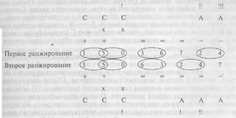Все случаи двух соседствующих цветов в обоих цветовых распределениях, обводятся, как показано выше. Соседство может сохранить порядок выборов, как в случаях с 1 и 5, 5 и 0, или же порядок может стать обратным, как в случае с 3 и 6 в первом ранжировании, которые ставятся как 6 и 3 во втором. Затем по «группам» (парам) или единичным номерам распределяются знаки: «+»-— для первого выбора, «х» — для второго п «—» — для последнего; знак «—» ставится у всех сохранившихся групп или единичных номеров. Отметим, что когда группы частично совпадают, то номер, появляющийся для обоих, принадлежит двум «функциональным» группам. Люшер полагает, что второе ранжирование более «спонтанно» и, следовательно, более валидно по сравнению с первым. Таким образом, вышеизложенный «отбор» будет записываться так: + 1 +5; х5хО;=6 =3; -2 =4; -7; +1 -7. Интерпретация проводится с помощью «интерпретационных таблиц», которые содержатся в руководстве. Эти таблицы разъясняются для получения «значения» каждого из паттернов. Из руководства не вполне понятно, должен ли быть использован материал первого ранжирования. В данном примере это будет так: + 1+5; х5хО; =3=6; =7; -2-4; в конце +1 —2 и +1 —4. Краткое изложение теории Люшера вы можете найти ниже. Необходимо отметить, что синий, зеленый, красный и желтый (пронумерованные соответственно 1, 2, 3 и 4) называются «основными» цветами, а другие — «добавочными». Утверждается, что хорошо приспособленный индивид в целом должен отдавать предпочтение психологическим основным или «базовым» цветам, а не «дополнительным» — «ахроматическим» — черному, серому и коричневому. Считается, что отказ от основ- ных цветов является показателем тревожности; соответственно любой основной цвет (1, 2, 3, или 4), появляющийся на одной из последних трех позиций, отмечается буквой А (первая буква слова «anxiety» (англ.) — тревожность), любой цвет, следующий за этим, отмечается также. Считается, что «компенсация» тревожности проявляется в предпочтении ахроматических цветов: ахроматический цвет (6, 7 или 0), появляющийся на одной из первых трех позиций, отмечается буквой С (первая буква слова «compensation» (англ,) — компенсация), таким же образом отмечаются цвета, стоящие до этого. «Интенсивность», или «компенсация» тревожности отмечается восклицательными знаками: один для основного цвета на шестой позиции, два на седьмой и три на восьмой; так же и для ахроматических цветов на третьей, второй и первой позициях соответственно. Общее количество восклицательных знаков в одном ранжировании (максимум 12) используется как показатель плохой адаптации. Если во втором ранжировании их меньше, чем в первом, это свидетельство хорошего прогноза. На примере 1000 «нормальных» взрослых показано, что среднее количество восклицательных знаков примерно равно 2—3, а в более чем 25 % случаев их вообще не было. Далее классифицируются «функциональные группы» (или «выборы цветов», то есть единичные цвета или пары) на основании той степени, в которой они «психологически желательны». Это обозначается звездочкой с максимальным значением три. Чем больше звездочек, тем меньшая «желательность». Говоря в общем, ахроматические цвета в позиции «+» и основные цвета в позиции «—» увеличивают «нежелательность», но так же справедливо и то, что «нежелательность» показывает отклонение от нормы. Приводимые цифры, охватывающие п