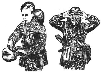 В положенні “ наготові ” протигаз переводиться за командою “ПРОТИГАЗ ПРИГОТУВАТИ” (рис.3.9), для чого: - сумка пересувається вперед так, щоби було зручно дістати протигаз двома руками; - клапан сумки відстібається (крім протигазів ПМГ і ПМГ‑2), а поясна тасьма обноситься навколо талії і закріпляється; - головний убір і каска готовляться до швидкого знімання (розв’язуються мотузки, розстібаються клапана та ремінці). В “ бойове ” положення (рис.3.10) протигаз переводиться за сигналом “ХІМІЧНА ТРИВОГА”, за командою “ГАЗИ”, а також самостійно (без команди і сигналів) під час виявлення радіоактивного зараження, отруйних речовин або біологічних засобів.