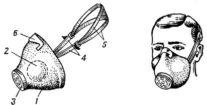 Респіратор Р-2Респіратор Р-2 (рис.3.13)призначений для захисту органів дихання від радіоактивного пилу та звичайного атмосферного (ґрунтового) пилу, а також служить для дій у вторинній хмарі біологічних засобів. Респіратор не захищає від токсичних газів і парів. Респіратор складається з фільтруючої напівмаски, двох клапанів вдиху, одного клапану видиху з захисним екраном, наголовника з двох еластичних та двох лямок, що не розтягуються, носового затискача. Фільтруюча напівмаска виготовлена з трьох шарів матеріалів: зовнішнього (пінополіуретану), внутрішнього (поліетиленової плівки), середнього (фільтруючого матеріалу ФПП із полімерних волокон).