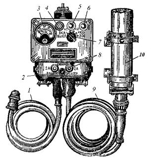 4.1.1.5. Вимірювач потужності дози(рентгенметр)ДП‑3Б Вимірювач потужності дози (рентгенметр) ДП‑3Б (рис. 4.4)призначений для виміру потужності експозиційної дози гамма-випромінювання в місцях розташування виносного блока детектування на рухомих об’єктах, в діапазоні від 0,1 до 500 Р/год. До комплект приладу входять: прилад ДП-3Б (у зборі: вимірювальний пульт, виносний блок детектування, скоби для кріплення, з’єднувальні кабелі); формуляр; технічний опис і інструкція з експлуатації; комплект ЗІП в укладці.. Підготовка приладу до роботи та перевірка працездатності 1. Ручку перемикача піддіапазонів поставити в положення «´1», при цьому загорається лампа світлової індикації, що сигналізує про прогрів електронної схеми. Після прогріву сигнальна лампа гасне. 2. Натимнути кнопку «ПРОВЕРКА». При цьому стрілка приладу повинна відхилитись до значень 0,4-0,8 поділок верхньої шкали, а сигнальна лампа – спалахувати. В решті положень перемикача діапазонів («´10», «´100», «500») показання приладу та частота спалахів сигнальної лампи зменшуються. Після проведення цих операцій перемикач поставити в положення «´1». Прилад готовий до роботи.