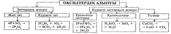 Күні: 5-тарау. Бейорганикалық қосылыстардың маңызды кластары. Сабақ тақырыбы: Оксидтердің жіктелуі,аталулары мен алу жолдары. Оқыту мақсаты: Оксидтер жайлы алған білімдерін еске түсіру арқылы жіктелуін, аталуын,кейбір оксидтердің алу жолдарын қорытындылау. Реактивтер мен құралдар: Темір(ІІІ)оксиді,сутек оксиді,магний оксиді, фосфор(V) оксиді,хром(ІІІ)оксиді,мырыш оксиді,кальций оксиді,мыс(ІІ)оксиді,т.б. Көрсетілім: Оксидтердің үлгілерімен танысу. Сабақ барысы: Ұйымдастыру кезеңі. Жаңа сабақ: Бейорганикалық заттардың жіктелуін еске түсіру. Оқушылар бейорга- никалық заттардың жіктелу кестесін бұрын алған біліміне сүйене отырып жасайды. Ол келесі сабақта толықтырылып, жалғасын табады. Бейорганикалық заттар Жай зат Күрделі зат Металл Бейметалл Оксид Қышқыл Негіз Тұз Негіздік Екідайлы Қышқылдық Жай және күрделі заттардың ережесін еске түсіреді. Күрделі заттардың негізгі кластарының ережелері сұралады. Содан кейін оксидтерді жіктеуді жалғастырады. Негіздік, екідайлы, қышқылдық болып бөлінеді, оларға мысалдар келтіру. Оксидтердің құрылымдық формулалары жазылып көрсетіледі.Оқулықпен жұмыс істеу арқылы жаңа тақырыптағы мазмұнды білу. Оксидтердің алынуы тірек-сызба арқылы түсіндіріледі.