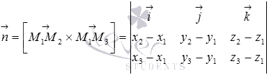 Нахождение уравнения плоскости, проходящей через три заданные точки. Уравнение плоскости, которая проходит через три заданные точки, не лежащие на одной прямой. Прежде чем приступать к составлению уравнения плоскости, проходящей через три заданные точки пространства, вспомним одну аксиому: через три несовпадающие и не лежащие на одной прямой точки трехмерного пространства проходит единственная плоскость. Таким образом, задав три различных и не лежащих на одной прямой точки, мы в трехмерном пространстве однозначно определим плоскость, проходящую через эти точки. Пусть в трехмерном пространстве зафиксирована прямоугольная система координат Oxyz, в ней заданы три несовпадающие точки Первый способ составления уравнения плоскости, проходящей через три заданные точки Известно, что общее уравнение плоскости вида Итак, из условия задачи нам известны координаты точки (даже координаты трех точек), через которую проходит плоскость, уравнение которой нам требуется составить. Осталось отыскать координаты нормального вектора Так как нормальный вектор плоскости и любой ненулевой вектор этой плоскости перпендикулярны, то вектор Второй способ нахождения уравнения плоскости, проходящей через три заданные точки Очевидно, что множество точек