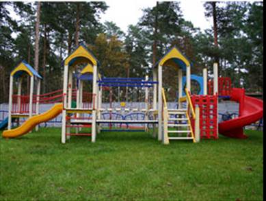 Рис.2.2. Декоративна кована металева урна «Квіткова» Згідно моїх проектних рішень територію скверу вирішено доповнити металічною кованою урною «Квіткова», у кількості 4 шт, чкі будуть розташовані біля лавок. Також саме ці декоративні урни по своєму дизайну добре підходять до паркових лавок. Дитячий майданчик Дитячий майданчик - місце, призначене для гри дітей, переважно дошкільного чи молодшого шкільного віку. Хоча старшим дітям та підліткам також цікаво буде позайматися на спортивниму гімнатсичному вуличному знарядді. Оптимальне місце для дитячого майданчика - паркова зона. Всі елементи дитячого майданчика мають відповідати віку, росту, вазі та фізичним можливостям дитини. Майте на увазі, облаштовувати дитячий майданчик необхідно у відповідності до вимог безпеки для ігрових елементів, таких як безпека матеріалів, максимальна висота вільного падіння, зони безпеки. Так, наприклад, дитячий майданчик для маленьких дітей по можливості слід розташувати в межах видимості з вікна приміщення, де знаходяться старші і достатньо близько, щоб Вам було чути, якщо малюк впаде та заплаче. Старшим зазвичай потрібна самота - у такому випадку дитячий майданчик можна відгородити рослинами, що плетуться, на спеціальних підпорках. Площадку під дитячий майданчик готують спеціально. Для початку необхідно максимально вирівняти поверхню майданчика. З метою безпеки під покриттям дитячого майданчика має бути покладена подушка з піску або гравію завтовшки 40-50см. Природно, для ігрової зони не використовується цегла, бетон або плитка. Також для дитячого майданчика не підходять сипучі матеріали - гравій дряпає руки і коліна, а пісок може потрапити в очі. Продається спеціальний відсів для дитячих майданчиків, який не має гострих граней і він не такий дрібний, як пісок. Оптимальним варіантом покриття для самих маленьких є м'яка і пружна зелена трава. Для посіву вибирають стійку до витоптування, що володіє підвищеною густотою травосуміш, як для спортивних та універсальних газонів. Найбільш економічний варіант - земля з додаванням піску чи глини на щебеневій подушці - використовують тільки на спортивних майданчиках або як тимчасове покриття. Найбільш популярні останнім часом - комфортні та довговічні мати з гумової крихти. Їх настилають впритул з допомогою кріпильних сталевих штифтів. Інший спосіб - гумове покриття "наливається" на весь майданчик за спеціальною технологією. Важливі переваги "наливних" виробів - рівна пружна поверхня без швів і гарна водонепроникність. Таке покриття можна вкладати на поверхню з будь-яким рельєфом, а в особливо небезпечних місцях посилити більш товстим шаром. Після дощу така "гума" швидко висихає і залишається чистою. Крім того, матеріал естетично виглядає і має безліч кольорів, що дозволяє спроектувати і гарний і безпечний дитячий майданчик. Облаштовуючи дитячу площадку не забувайте про дорослих. Мінімально - лавочки для батьків немовлят, смітники. Не лишнім буде встановлення арки, огорожі - для остаточного оформлення ігрових майданчиків. Вони дозволяють батькам комфортно розташуватися на виділеній території поблизу своїх дітей. Секції огородження, лавки виробляють в двох-трьох варіантах з труб різного діаметру, що дозволяє підібрати вартість дитячого майданчика в цілому. Обладнані таким чином площадки гармоні