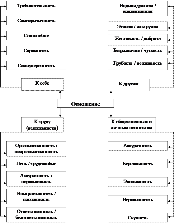 Рис. 98. Черты характера К первой группе относятся черты, проявляющиесяпо отношению к другим людям: родным и близким, товарищам по работе и учебе, знакомым и малознакомым и т.п. Устойчивая и неустойчивая привязанность, принципиальность и беспринципность, общительность и замкнутость, правдивость и лживость, тактичность и грубость обнаруживают отношение человека к другим людям. Вторую группу составляют черты, которые проявляются по отношению к деятельности. Так, к числу наиболее ценных черт характера относятся добросовестность и исполнительность, серьезность, энтузиазм, ответственность за порученное дело и озабоченность его результатами. Третья группа – это система отношений человека к самому себе. В эту группу входят такие черты, как скромность и самовлюбленность, самокритичность и самоуверенность, гордость и приниженность, неуверенность в своих силах. Четвертая группа включает черты, характеризующие отношение личности к вещам, причем не только отношение к собственности вообще, но и аккуратное или небрежное обращение со своими вещами, с одеждой, обувью, книгами и т.п. Любая черта характера человека, являя собой некоторый устойчивый стереотип поведения, имеет разную количественную степень выраженности. Наиболее общие свойства характера располагаются по осям: сила – слабость, твердость – мягкость, цельность – противоречивость и т.д. Когда количественная выраженность той или иной черты характера оказывается у крайней границы нормы, возникает так называемая акцентуация характера. Как считает один из ведущих исследователей данной проблемы А.Е. Личко, акцентуация характера – это крайние варианты нормы, при которых отдельные черты характера чрезмерно усилены, отчего обнаруживается избирательная уязвимость человека в отношении определенного рода психогенных воздействий при хорошей и даже повышенной устойчивости к другим. В обычных условиях наличие той или иной акцентуации не всегда заметно окружающим, она не проявляется в поведении и не препятствует социальной адаптации. Это так называемая скрытая (латентная) акцентуация. Такая акцентуация может появиться неожиданно под воздействием каких-то стрессогенных (психогенных) факторов, и то лишь в определенных условиях, усиливающих степень выраженности определенной черты. Если психическая травма, эмоциональный стресс или просто трудная ситуация в жизни задевают эту уязвимую черту, то возникают разного рода срывы. Все же другие воздействия на психику, сознание человека, не направленные на наиболее уязвимые точки характера, обычно переносятся им без осложнений, не доставляя никаких неприятностей ни ему самому, ни окружающим. Выделяют несколько типов акцентуации характера (табл. 7) [61]. Таблица 7 Типы акцентуации характера