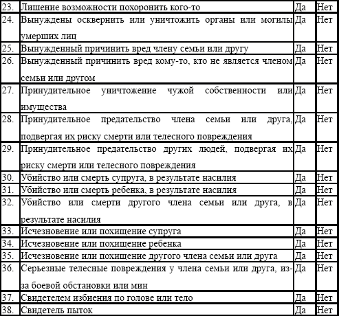 Вторая часть: личное описание Просьба указать, какие вы считаете наиболее вредные и страшные события, которые вы испытали, если таковые имеются. Пожалуйста, укажите, где и когда эти события происходили. _____________________________________________________________________ _____________________________________________________________________ _____________________________________________________________________ _____________________________________________________________________ _____________________________________________________________________ _____________________________________________________________________ ______________________________ В вашей нынешней ситуации (например, лагерь беженцев, центр переселения, возвращение из ссылки и т. д.), что является худшим событием, которое произошло с вами, если отличается от вышеуказанных. Пожалуйста, укажите, где и когда эти события происходили. _______________________________________________________________________ _______________________________________________________________________ _______________________________________________________________________ _______________________________________________________________________ _______________________________________________________________________ _________________________ Если вы ответили утвердительно на следующие травмирующие события, укажите, пожалуйста, если вы потеряли сознание и как долго это продолжалось