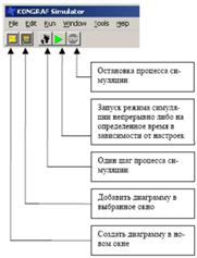 Назначение симулятора Программа симулятора предназначена для отладки пользовательского алгоритма, разработанного на базе ИС КОНГРАФ без использования контроллера. Можно проводить симуляцию любого алгоритмического блока проекта (ФБ, комплексный ФБ, блок прибора, сегмент сети (проект)). По ходу создания алгоритма блока МС8 были отмечены параметры для формирования списка просмотра в симуляторе (проставили галочки в поле “Список симулятора” для параметров в первом блоке ТСМ 50 ЗПР: Вход1 [мВ], Вход2 [мВ], Температура [C°]) и в последнем блоке ИЛИ - Выход). Далее, после запуска программы симулятора, любой из выбранных параметров может быть выведен на диаграмму для графического представления. Перед запуском симулятора следует сохранить все ранее произведенные изменения в проекте. Сохранить нужно и главный блок проекта, поскольку симулируется весь проект в целом, отображаются же только параметры, входящие в активное окно, т.е. в тот алгоблок, который открыт при вызове команды запуска симуляции Проект/Симулятор. Запуск симуляции производится или командой меню " Проект/Симулятор " или кнопкой на панели инструментов При проведении симуляции предварительно (до непосредственно запуска симуляции) открывается окно КОНГРАФ Simulator. В окне выводятся приборы и параметры, принадлежащие этим приборам и предназначенные для симуляции, т.е. те параметры, которые включены в дополнительный список “Список симулятора” (рис.15.).