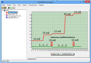 Окно симулятора разделено на две области: Левая область симулятора предназначена для отображения информации в текстовом виде, причем входные и выходные параметры выделены для удобства соответствующими маркерами (красный - вход, синий - выход). Рядом с параметрами отображается их текущее значение. Правая область симулятора предназначена для вывода значений выбранных параметров виде графиков (временных диаграмм). Во время симуляции на диаграммах строятся графики изменения выбранных параметров из списка симулятора. Анализ получаемых графических данных помогает сделать выводы о правильности выполнения алгоритма активного блока. По умолчанию в окне симулятора отображается только одна диаграмма. В каждой такой диаграмме можно разместить неограниченное количество параметров. Внизу диаграммы отображаются имена параметров, которые в нее добавлены, а также цвет графика для каждого параметра. Для вывода значения параметра в графическом виде достаточно «перетащить» с помощью мыши необходимый параметр из текстовой области на область диаграммы. При этом в легенду диаграммы автоматически добавляется наименование выбранного параметра (рис.16 и рис.17). Окно диаграмм можно разбить также на страницы, на каждой из которых можно создать дополнительные диаграммы.