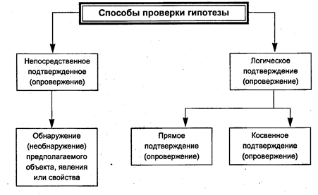Непосредственное подтверждение (опровержение) гипотезы. Сущность этого способа заключается в том, что предполагаемые отдельные факты или явления в ходе последующего познания подтверждаются (или не подтверждаются) практикой наблюдения за правовыми явлениями. Логическое подтверждение (опровержение) протекает опосредованно, так как познаются явления, имевшие место в прошлом или существующие и в настоящее время, но недоступные непосредственному чувственному восприятию. Основными путями этого способа проверки гипотезы являются: индуктивное, все более полное подтверждение гипотезы или выведение из нее следствий аргументами, включающими указание на факты и законы; дедуктивное выведение гипотезы из других, более общих и уже доказанных положений; демонстрация эвристической, предсказательной силы гипотезы, когда с ее помощью правильно объясняется и предсказывается довольно широкий круг явлений. Логическое доказывание (опровержение) гипотезы в зависимости от способа обоснования может осуществляться в форме прямого или косвенного доказательства (опровержения). Прямое подтверждение (опровержение) гипотезы протекает путем подтверждения или опровержения выведенных логических следствий вновь обнаруженными фактами. Логический процесс выведения следствий из выдвинутого предположения и обоснования истинности или ложности гипотезы, как уже отмечалось, осуществляется очень часто в форме условно-категорического умозаключения. Например, из предполагаемой причины А выводят следствие В. Логически это выражается в таком суждении: «Если есть А, то есть В». Затем следствие В проверяют на практике, действительно ли оно существует. Если следствие В в действительности не существует и существовать не может, то по правилам условно-категорического умозаключения от отсутствия следствия приходят к выводу о том, что и предполагаемая причина А также не существует, то есть к достоверному заключению о ложности выдвинутой гипотезы. Помимо условно-категорических умозаключений используется также категорический силлогизм и другие виды умозаключения. Другим видом логического доказывания гипотезы является ее косвенное подтверждение (опровержение). Оно используется тогда, когда существует несколько гипотез, объясняющих одно и то же явление. Косвенное доказательство протекает путем опровержения (подтверждения) и исключения всех ложных (истинных) предположений, на основании чего утверждают о достоверности (ложности) единственного оставшегося предположения. Вывод при этом протекает в форме отрицающе-утверждающего модуса разделительно-категорического умозаключения. Заключение в этом выводе может расцениваться как достоверное, если, во-первых, построен исчерпывающий ряд предположений, объясняющих исследуемое явление, во-вторых, в процессе проверки гипотез опровергнуты (подтверждены) все ложные (истинные) предположения. Предположение, указывающее на оставшуюся причину, в этом случае будет единственным, а выраженное в нем знание будет выступать уже не как проблематичное, а как достоверное. Таким образом, разработка и применение гипотезы играет большую роль в правовой сфере. Особую значимость для юристов имеет общая логика построения и доказательства версий.
