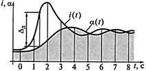 Динамическая погрешность – это погрешность СИ, возникающая при измерении изменяющейся в процессе измерений физической величины. Предположение о статической модели объекта (без имеющихся на то оснований) может привести к большим ошибкам. Инерционность прибора при быстроменяющихся входных сигналах рождает динамическую погрешность результата измерения, а иногда и просто приводит к невозможности определить результат. Например: магнитоэлектрический амперметр не в состоянии зафиксировать кратковременный (длительностью менее 1 с) импульс тока. На рис. 9 показано возникновение динамической погрешности Δд при протекании через магнитоэлектрический измерительный механизм быстро меняющегося тока. На рис. 9 изображены кривая изменения тока i (t),текущего через механизм, и кривая изменения показаний α(t). Механическая инерционность подвижной части прибора приводит к неизбежному отставанию ее реакции при быстрых изменениях тока. Возникающая при этом динамическая погрешность Δд тем больше, чем выше скорость изменения i (t)и чем больше масса подвижной части.
