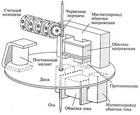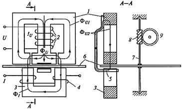 Рис. 26. Схема, поясняющая принцип действия счетчика: 1 – магнитопровод обмотки напряжения; 2 – обмотка напряжения; 3 – магнитопровод обмотки тока; 4 – обмотка тока; 5 – противополюс; 6 – диск; 7 – ось; 8 – червячная передача; 9 – счетный механизм