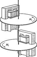 Трехфазные счетчики. Для учета суммарной активной и реактивной энергии в трехфазных цепях используются двухэлементные и трехэлементные счетчики. В таких счетчиках применяются те же конструктивные элементы (два или три механизма), что и в однофазных приборах. Диски (два или три) закреплены на общей оси. Вращающие моменты дисков складываются, и скорость вращения оси зависит от суммарной текущей потребляемой мощности. На рис. 29 упрощенно показано устройство двухэлементного трехфазного счетчика.
