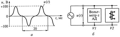 Рис.35. Реакция и показания приборов: а - входной сигнал; б - схема включения приборов В данном эксперименте вольтметр V1,отреагировав на U с.в.= 100 В, покажет UV1 = 100 · 1,11 = 111 В, что не будет соответствовать реальному действующему значению измеряемого напряжения. Второй вольтметр V2 (электронный термоэлектрический) реагирует на истинное СКЗ напряжения и отградуирован, естественно, тоже в СКЗ. Поэтому его показание UV2 -правильное действующее значение входного сигнала, которое в данном случае равно 100 В. Отметим, что разница между показаниями двух исправных приборов, подключенных к одному источнику напряжения, довольно велика и составляет более 10 %. Причина - резкая несинусоидальность входного напряжения u (t). Рассмотрим еще один пример. Два вольтметра: V1 -электронный вольтметр с амплитудным детектором (АД) и V2 - электромеханический вольтметр электромагнитной системы параллельно подключены к источнику несинусоидального напряжения u (t)| (рис. 36, а). Амплитуда измеряемого напряжения U max= ±100 В, частота - 50 Гц, коэффициент амплитуды k а = 2. Пренебрегая всеми погрешностями, найдем показания приборов (рис. 36, б). Первый вольтметр V1 реагирует на амплитудное значение U maxвходного напряжения, а градуируется в действующих значениях для случая синусоидального сигнала, т.е.его показания UV1 связаны с его реакцией коэффициентом амплитуды k асинусоиды (k а sin = 1,41): UV1 = U max / k а sin. В этом эксперименте вольтметр V1,отреагировав на амплитуду U max = 100 В, покажет UV1 = 100:1,41≈ 71 В, что не равно реальному действующему значению измеряемого напряжения. Реальное действующее (среднее квадратическое) значение U с.к.у данного сигнала: U с.к = U max / k а = 100: 2 = 50 В.