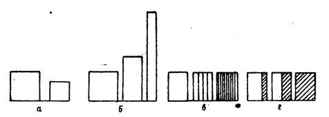 Положение объектов относительно друг друга характеризуется заглубленностью или выступом одной из форм, расположением на одном или нескольких уровнях. Масса формы в композиции рассматривается только с точки зрения зрительного восприятия. Это свойство может изменяться в следующих направлениях: - большей по величине форме соответствует большая масса (рис.3 а); - объемный предмет имеет большую массу, чем пространственный (рис.3 б); - масса зависит от степени плотности заполнения ею формы (рис. 3 в); - масса зависит от величины сопоставляемого с ней пространства (рис.З г).