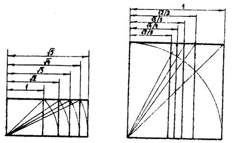 З.З. Основные средства композиции. Для придания объекту художественных качеств существует целый ряд приемов, называемых средствами композиции, К ним относятся: пропорционирование, метрический и ритмический повторы, масштабность, нюанс и контраст, цвет и светотень. Пропорции вархитектуре и промышленном искусстве могут выступать как отношения линейных размеров, площадей или объемов отдельных элементов друг к другу и к объекту в целом. Известные пропорциональные отношения делятся на две группы: простые и иррациональные. Простыми называются отношения, где числитель изнаменатель - целые числа в пределах от I до 6 (условно). Простые отношения содержат всебе модуль, укладывающийся целое число раз в каждой пространственной величине. В классической архитектуре, например, модулем являлся какой-нибудь линейный размер сооружения, обычно диаметр нижнего основания колонны. В основе иррациональных отношений лежат геометрические построения, выполненные исходя из несоизмеримых (иррациональных) отношений величин. Пропорционировать значит задавать соотношения между размерами элементов изделия на основе какой-либо закономерности. Наиболее употребительны следующие соотношения. Отношение диагонали прямоугольника к его стороне. Для квадрата со стороной I это отношение равно √2, поэтому прямоугольник, построенный на диагонали квадрата, называется прямоугольник √2. Дальнейшее аналогичное построение дает прямоугольники √3, √4 и т.д. (рис. 6). Возможно и обратное