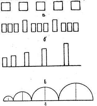Интересны опыты психофизиолога Фехнера, который проверял предпочтительность различных пропорций. Испытуемым были предложены 10 прямоугольников с различным отношением сторон. Из 532 человек 35% выбрали прямоугольник в пропорции "золотого сечения". Физиологически это может быть обусловлено тем, что такой прямоугольник равномернее заполняет поле зрения человека, так как эллипс нашего зрения составляет 3:5=0,60, а коэффициент "золотого сечения" составляет 0,618. Помимо указанных закономерностей для пропорционирования теоретически может быть использована любая математическая зависимость, в том числе довольно сложного порядка. Однако инженер-конструктор и дизайнер должны помнить, что пропорции изделия связаны с его инженерной компоновкой. Чем точнее учтены в конструкции истинные усилия, тем логичнее она в целом и в деталях. Все, что конструктивно нелогично, заведомо непропорционально. Если художник, пренебрегая инженерной стороной, рисует форму только ради красивых пропорций, то неизбежно возникают неоправданные пустоты, увеличиваются габариты и вес изделия. С другой стороны, пропорционирование в технике нельзя рассматривать лишь как средство эстетизации. Оно дает и непосредственный инженерный эффект. Пропорционально спроектированный станок обладает лучшими техническими показателями, меньшей металлоемкостью. Ритм и метр в композиции. Ритмом в композиции называется закономерное изменение какого-либо свойства формы в ряду сопоставляемых форм. Простейшее выражение ритма - повторение элементов через правильно увеличивающиеся или уменьшающиеся интервалы (рис.9, а-г). Ритмический порядок характеризуется динамикой - нарастанием или убыванием какого-либо свойства. Частным случаем ритмического порядка является метрический порядок, характеризуемый статичностью, неизменностью повторяемых форм. Метрические ряды могут быть простыми и сложными, состоящими из коротких ритмических рядов. Построение ритмического ряда часто осуществляют в геометрической прогрессии. При этом изменяться может величина объекта, интервалы между ними, цвет и некоторые другие свойства.