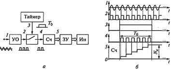 ЦИФРОВЫЕ ЧАСТОТОМЕРЫ Начинать изучение цифровых измерительных приборов удобно и логично с рассмотрения устройства и принципа действия самого простого и понятного по структуре и набору основных процедур преобразования представителя ЦИП - цифрового частотомера (ЦЧ). Многие формы преобразования, выполняемые в ЦЧ, лежат в основе большинства других ЦИП. Цифровые частотомеры - довольно распространенные измерительные приборы, используемые в самых различных отраслях науки, техники, промышленности для оценки частотно-временных параметров электрических сигналов. Они работают в очень широком диапазоне значений измеряемых частот периодических сигналов (или их периода). Современные ЦЧ обеспечивают самые высокие метрологические характеристики (точность и разрешающую способность) среди всех прочих ЦИП, отличаются достаточно высоким быстродействием, широкими функциональными возможностями, простотой эксплуатации, высокой надежностью. Помимо измерения частотно-временных параметров периодических сигналов, современные ЦЧ применяются и для измерения различных физических величин. Для этого необходимо подключать к ЦЧ вспомогательные первичные измерительные преобразователи (датчики), имеющие выходные сигналы, частота или период (длительность) которых пропорциональны измеряемой величине. Например, ЦЧ можно использовать для измерения скорости вращения вала двигателя, или расхода жидкости в трубопроводе, или скорости потока воздуха. Цифровые частотомеры находят также применение в качестве генераторов стабильных частот и таймеров постоянных или программируемых интервалов времени. Кроме того, с помощью ЦЧ легко можно организовать подсчет числа импульсов (числа событий). Практически все ЦЧ обеспечивают два основных режима работы: измерения частоты и измерения периода (длительности интервала времени). Рассмотрим структуры, принципы действия и погрешности ЦЧ в этих режимах. Упрощенная структура ЦЧ, реализующая режим измерения частоты, показана на рис. 66, а, а временные диаграммы работы в этом режиме приведены на рис. 68, б. Исследуемый периодический сигнал 1 (соответственно диаграмма 1) подается на вход усилителя-ограничителя УО, где преобразуется в последовательность прямоугольных импульсов 2 (диаграмма 2) фиксированной амплитуды, частота которых равна частоте fx входного сигнала. Далее этот сигнал поступает на вход электронного ключа, которым управляет таймер, периодически замыкающий его на постоянный стабильный интервал времени 3 (диаграмма 3), например Т 0 = 1 нс. Сформированная таким образом серия импульсов 4 (диаграмма 4) поступает на вход счетчика Сч, содержимое которого 5 в начале интервала Т 0 равна нулю, а в конце интервала счета равно числу поступивших импульсов Nx. Это число прямо пропорционально измеряемой частоте fx входного сигнала: Nx = Ent [ Т 0 / Тx ] = Ent [ Т 0 fx ], где Ent […] – оператор определения целой части выражения […]; Тx – период входного сигнала (Тx = 1/ fx); fx – частота входного сигнала.