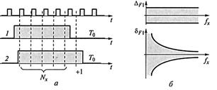 Рис. 71. Суммарные абсолютная (а) и относительная (б) погрешности Видно, что чем меньше значение измеряемой частоты fx в этом режиме, тем (при постоянном интервале Т 0)хуже, так как тем больше относительная погрешность δ F. Для уменьшения этой погрешности необходимо увеличивать интервал Т 0,но нецелесообразно его делать слишком большим. Так, например, длительность интервала Т 0= 10 с уже неудобна для работы, так как значительное время ожидания появления каждого нового результата (10 с) может вызвать у оператора раздражение. Для измерения сравнительно низких частот удобнее использовать второй режим ЦЧ – режим измерения периода (см. ниже) исследуемого входного сигнала Тх = 1/ fx. Рассмотрим пример определения погрешностей результата измерения частоты. Предположим, известны значение интервала Т 0= 1 с и возможная погрешность его задания D Т 0 = ±2 мс. Получен результат измерения частоты fx = 1 кГц. Оценим значения составляющих и суммарной погрешности результата. Значения абсолютных аддитивной D F 1 и мультипликативной D F 2 погрешностей, соответственно равны: D F 1 = ± 1/ Т 0 = ± 1 Гц; D F 2 = fx · D Т 0 / Т 0 = (± 1000 · 2 · 10 – 3) / 1 = ± 2 Гц. Значения относительных аддитивной δ F 1 и мультипликативной δ F 2 погрешностей определим обычным образом: δ F 1 = (D F 1 / fx) · 100 = ±(1/1000) · 100 = ±0,1 %; δ F 2 = (D F 2 / fx) · 100 = = ±(2/1000) · 100 = ±0,2 %. Суммарные абсолютная D F и относительная δ F погрешности результата измерения частоты fx соответственно равны: D F = D F 1 + D F 2 = ±3 Гц; δ F = δ F 1 + δ F 2 = ±3%.