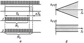 Рис. 69. Аддитивная погрешность в режиме измерения частоты: а – возникновение; б – абсолютная и относительная погрешности Погрешность D F 1 – случайная величина, поскольку входной сигнал и сигнал таймера в общем случае никак не связаны между собой. Максимально возможное значение этой погрешности неизменно и составляет одну единицу младшего разряда – один квант: D F 1 = ± 1 импульс = ± 1 / Т 0. Таким образом, D F 1 – это аддитивная погрешность, т.е. не зависящая от значения измеряемой величины – частоты fx (рис.70, б). Погрешность D F 2 вызвана неточностью (неидеальностью) задания интервала Т 0 (рис.70. а). Если бы длительность интервала Т 0 имела бы строго номинальное значение, то число импульсов, поступивших в счетчик, было бы равно N 1 (рис. 70. а). Если же интервал Т 0 будет, например, несколько больше номинального и составит Т 0 + D Т 0, то при той же измеряемой частоте fx в счетчик поступит больше импульсов N 2 > N 1. Неточность D Т 0 задания этого интервала приводит к появлению мультипликативной, т.е. линейно зависящей от значения измеряемой частоты fx, составляющей: D F 2 = ± fx · D Т 0 / Т 0.