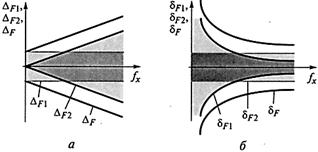 Рис. 70. Мультипликативная погрешность в режиме измерения частоты: а – возникновение; б – абсолютная и относительная погрешности Суммарная абсолютная погрешность D F результата измерения частоты fx и суммарная относительная погрешность δ F, %, равны, соответственно: D F = D F 1 + D F 2 = ± (1/ Т 0 + fx · D Т 0 / Т 0); δ F = δ F 1 + δ F 2 = ±(1/ Т 0 fx + D Т 0 / Т 0) · 100. Графическая иллюстрация поведения составляющих и суммарных абсолютной и относительной погрешностей результата измерения частоты fx приведена на рис. 71, а и б,соответственно.