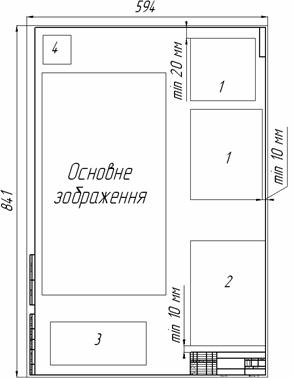 а б Рисунок 1 – Розташування елементів креслень при горизонтальному (а) і вертикальному (б) розміщенні зображення: – для генерального плану: 1 – техніко-економічні показники, – для технологічних планів і розрізів: 2 – перелік обладнання, – для апаратурно-технологічної схеми: 1 – перелік ліній руху сировини, 2 – перелік обладнання, 3 – умовних позначень точок ТХК; – для схеми автоматизації: 3 – перелік обладнання.