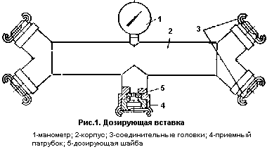 Дозирующая вставка состоит из цилиндрического корпуса 2 с соединительными головками 3 для пожарных рукавов, по которым поступает вода. Пенообразователь во вставку поступает от насоса пожарного автомобиля пенного тушения по пожарному рукаву через дозирующую шайбу 5, расположенную в приемном патрубке 4. При подаче пенообразователя в дозирующую вставку насос, подающий пенообразователь, должен создавать напор от 2 до 30 м (в зависимости от числа подключенных пеногенераторов) и всегда должен быть выше напора в рукавной линии. Дозирующие вставки можно устанавливать и на всасывающей линии. В этом случае они должны быть оборудованы соответствующими присоединительными головками.