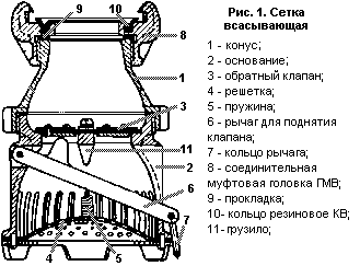 Всасывающая сетка состоит из основания 2 с боковыми прорезями и конуса 1 (надклапанной части). В верхней части конуса 1 расположен резьбовой штуцер для присоединения соединительной всасывающей головки ГМВ. В основании 2 всасывающей сетки расположены обратный клапан 3 и рычаг 6 для поднятия клапана. В нижней части основания 2 расположена предохранительная сетка 4.