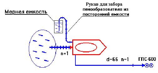 Порядок проведения испытания насоса: Пожарный автомобиль устанавливался на искусственный водоем на два всасывающих рукава, высота всасывания составляла два метра. К выходным патрубкам насоса подсоединялись по одному рукаву диаметром 66 мм. со стволом А.(насадки свернуты). Включался насос и вода подавалась при полном открытии задвижек на выходных патрубках. Частота вращения рабочего колеса насоса составляла 2700 об/мин Результаты испытаний: напор, создаваемый пожарным насосом составил 10 атмосфер, что соответствует номинальному значению параметров ПН. Схема испытания насоса: 2.Порядок проведения испытания пеносмесителя ПС-5: пожарный автомобиль устанавливался на водоисточник (высота всасывания 2 метра), к выходному патрубку присоединяется поочередно 3 рукава диаметром 66 мм со стволом ГПС-600 на каждой линии. Гафрированный рукав для забора пенообразователя из посторонней емкости подсоединялся к насосу и мерной емкости другой стороной. Мерная емкость объемом 10 литров заполнена водой. Включался насос. Давление во всасывающей полости составило 0.25 МПа; в рабочей полости 0,6 МПа Перепад давления в напорной и всасывающей полости составил более 50 м. водного столба (5 атмосфер). Включался ПС. Дозатор пеносмесителя устанавливался поочередно на шкалы 1,2,3. Результаты испытаний:.