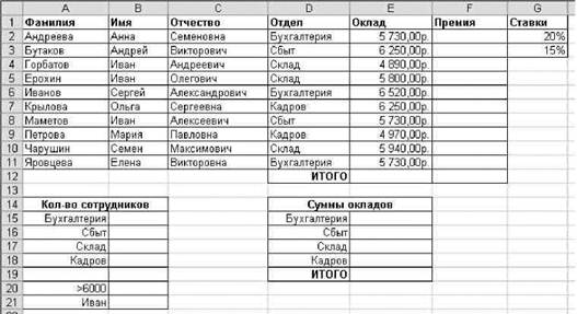3. Определите общее количество сотрудников по каждому из отделов. 4. Подсчитайте количество сотрудников, имеющих оклад больше 6000 р. 5. Определите количество сотрудников с именем «Иван». 6. Подсчитайте общую сумму окладов сотрудников каждого отдела.