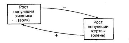 В экосистеме постоянно осуществляются процессы перехода веществ и энергии с одних уровней трофической цепи на другие, поэтому экосистема не является абсолютно стабильным неизменным образованием. В любой экосистеме постоянно происходит изменение численности и плотности популяций в результате взаимодействия хищников с жертвами, а жертв с источниками их питания. Но одновременно с этим подвижность экосистемы является относительной, например экосистемы таежных лесов или целинных степей существуют длительное время (сотни лет) и, на первый взгляд, стабильны, устойчивы, неизменны. За короткий отрезок времени в них трудно обнаружить значительные изменения в составе популяций или режимах факторов неживой природы, хотя в отдельных случаях массовые размножения некоторых видов животных (например, лесных насекомых) существенно изменяют экосистему на тот или иной отрезок времени, а иногда способствуют ее замене на другую. Следовательно, экосистемы с одной стороны, действительно являются стабильными образованиями, а с другой стороны динамичны и подвижны в пространстве и времени. В том случае, если бы экосистемы существовали короткий отрезок времени, и происходило бы быстрое замещение одной экосистемы на другую, то накопление питательных веществ и стабильное развитие и размножение живых организмов было бы невозможно. Подвижно-стабильное состояние биогеоценозов (экосистем) во времени и пространстве представляет собой результат двух процессов: гомеостаза и сукцессии. Между всеми компонентами экосистемы (биогеоценоза) происходят процессы обмена веществом и энергией, эти процессы сбалансированы между собой, а сам биогеоценоз характеризуется устойчивостью. Таким образом для биогеоценоза свойственно состояние подвижного равновесия, или гомеостаза (от греч. homоs - тот же, подобный, stasis - состояние). Гомеостаз с точки зрения кибернетики обеспечивается механизмами обратной связи. Принцип обратной связи состоит в том, что некоторый управляющий компонент той или иной системы получат данные (информацию) от управляемых компонентов и использует эту информацию для внесения коррективов в дальнейший процесс управления. Действия механизма обратной связи можно рассмотреть на примере популяций двух видов: оленя и волка (рис.3.8). В данном случае волк является хищником и поедает оленей, а олень является жертвой. В случае, если численность популяции оленей начнет возрастать, хищник, питающийся только этой жертвой, имеет возможность увеличить свою численность, и соответственно качественно и количественно улучшить свою популяцию. В данном случае проявляется положительная обратная связь (рис. 3.8.). Но, питаясь оленями, в свою очередь волк (хищник) снижает численность популяции оленя. В данном случае проявляется отрицательная обратная связь. Если численность волка превысит некоторый предел, то он соответственно снизит численность оленя и в итоге окажется перед необходимостью ограничения собственной численности из-за нехватки пищи, связанной с затрудненностью ее добычи. Аналогичная ситуация складывается с насекомыми, питающимися листьями деревьев. Пока имеется избыточная биомасса листьев, насекомые могут размножаться (положительная связь). Но резкое возрастание численности насекомых приведет к уменьшению биомассы листьев (отрицательн