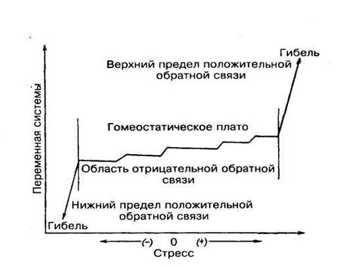 Рис.3.9. Схема формирования гомеостатического плато в экосистеме, в пределах которого посредством отрицательной обратной связи поддерживается относительная стабильность системы при воздействиях, вызывающих нарушение сбалансированности [1]