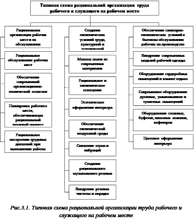 ТЕМА 3. ОРГАНИЗАЦИЯ РАБОЧЕГО МЕСТА. УСЛОВИЯ ТРУДА НА РАБОЧЕМ МЕСТЕ Основные понятия: рабочее место и его виды; элементы организации; типовой проект организации рабочего места; виды оснащения рабочего места; внешняя и внутренняя планировка рабочего места; ее задачи; зоны досягаемости; функции; системы, формы обслуживания рабочих мест; аттестация рабочих мест; условия труда на рабочем месте, их содержание; характеризующие факторы; категория тяжести труда; методы оценки состояния работоспособности; фазы работоспособности; виды режимов труда и отдыха; методы сохранения работоспособности. Рабочее место – часть производственного пространства или зона трудовых действий, оснащенная необходимыми средствами труда, на котором выполняется порученная функция (задание, работа) исполнителем или группой исполнителей. Рабочие места классифицируются: по выполняемым функциям; по профессиональному признаку; по признаку разделения труда (индивидуальные и коллективные; по степени механизации выполняемых работ (ручные, ручные механизированные, машинно-ручные, машинные, автоматизированные, аппаратурные), по степени специализации: специальные, специализированные, универсальные. Специализация есть установление (определение) рационального рабочего профиля рабочего места, выражающееся в закреплении определенного количества работ, операций, услуг. За специальным рабочим местом закреплено 1–3 операции, применяется в массовом типе производства, при поточных методах изготовления продукции. За специализированным рабочим местом закреплено 3–10 операций, применяется в серийном производстве, при партионных методах обработки. На универсальном рабочем месте выполняется 10 операций и более, используется в единичном производстве, при индивидуальных методах изготовления продукции. Организация рабочего места заключается в его соответствующем оснащении и планировании, исходя из особенностей труда. Организация рабочего места включает три общих элемента: оснащение, планировку, обслуживание. Оснащение включает все необходимые для трудового процесса средства труда. Планировка есть рациональное размещение рабочих мест на производственной площади, пространственное размещение в пределах каждого рабочего места технологического и вспомогательного оборудования, организационной оснастки. Обслуживание – это составная часть производственного процесса, направленная на обеспечение бесперебойного и эффективного функционирования рабочего места. Типовой проект организации рабочего места – организационный документ, в котором сосредоточены типовые, то есть характерные для многих рабочих мест определенной специальности решения и рекомендации по оснащению и планированию рабочего места. Стандартное содержание проекта организации рабочего места: · введение; · назначение и характеристика рабочего места; · оснащение рабочего места; · планировка рабочего места; · требования техники безопасности и охраны труда; · основные требования к работнику; · документация на рабочем месте; · расчеты экономической эффективности от использования типового проекта. К элементам организации труда на рабочем месте относятся: специализация рабочего места, его кооперация с другими рабочими местами, организация рабочего места и система его обслуживания, приемы и ме