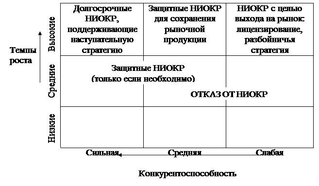 Анализ и выбор предпочтительной стратегии НИОКР для крупной многопродуктовой компании возможен на основе матрицы 3x3 темпов роста рынка и конкурентоспособности. Основные стратегические альтернативы такой матрицы показаны на рис. 15.