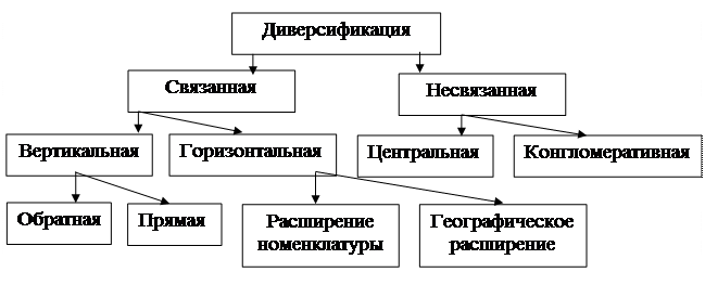 n Виды диверсификации. Различают связанную и несвязанную (конгломератную) диверсификацию. В свою очередь, связанная диверсификация может быть вертикальной или горизонтальной (рис. 17). Основным критерием определения типа диверсификации является принцип слияния. При функциональном слиянии объединяются предприятия, связанные в процессе производства. При инвестиционном слиянии объединение происходит без производственной общности предприятий.
